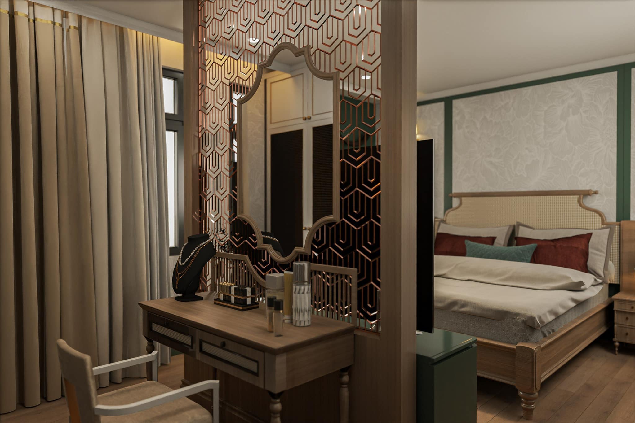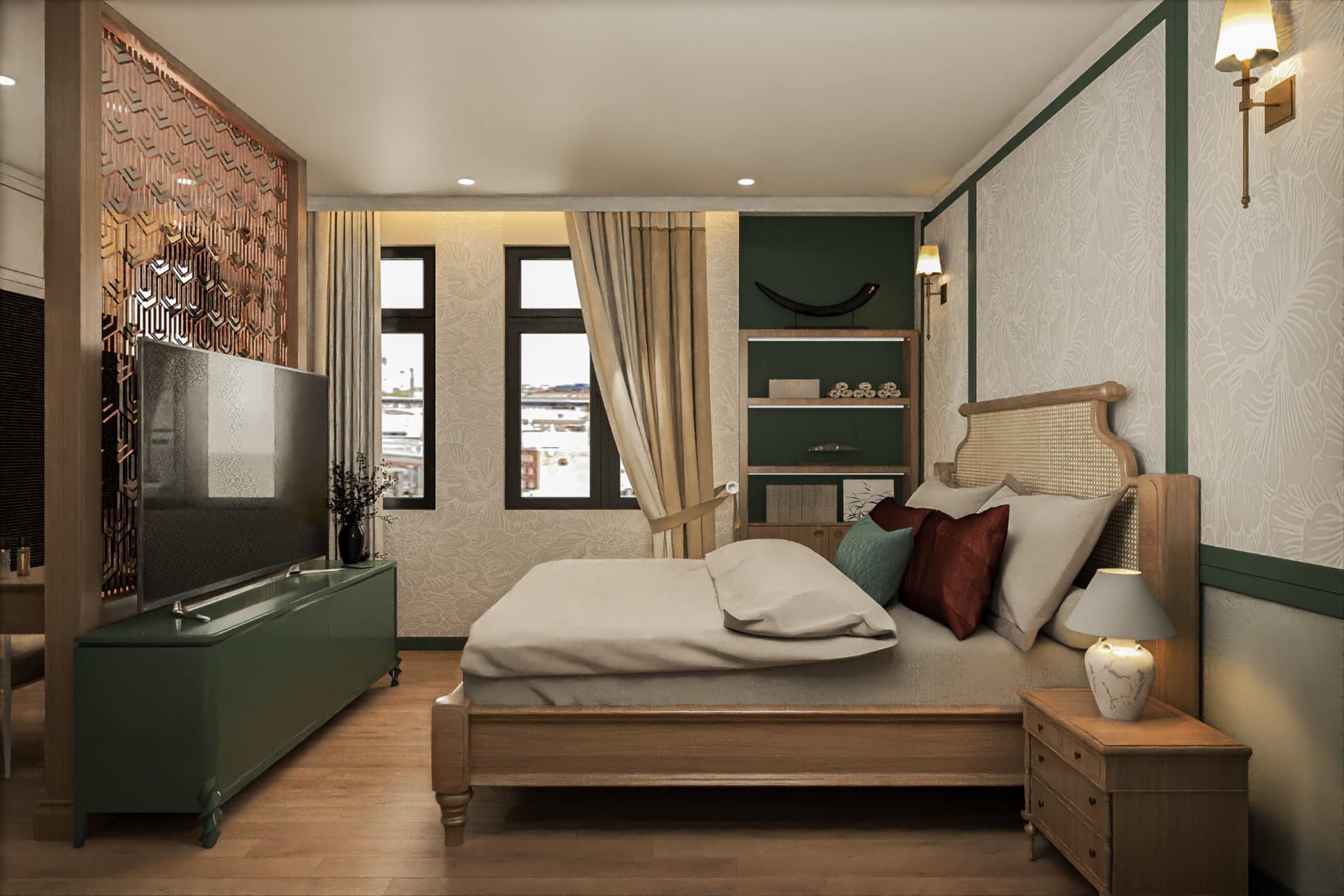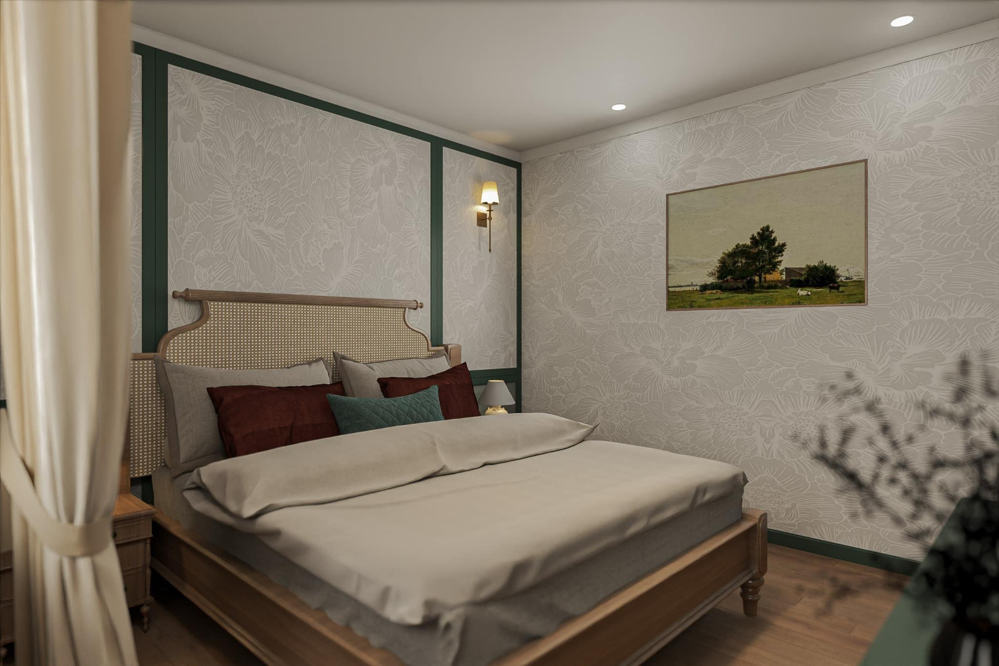 - Ba phòng ngủ riêng biệt: mỗi phòng mang nét đặc trưng riêng nhưng vẫn đồng điệu trong tổng thể Farmhouse.