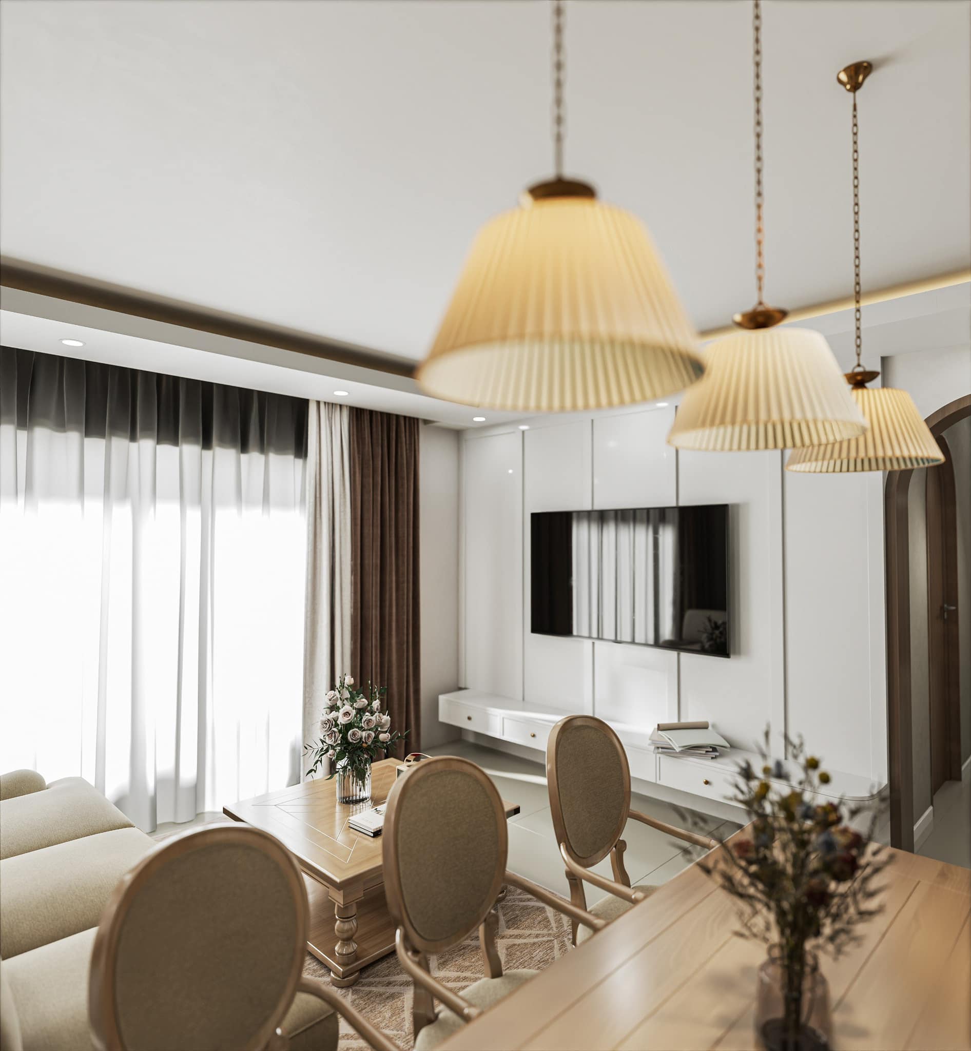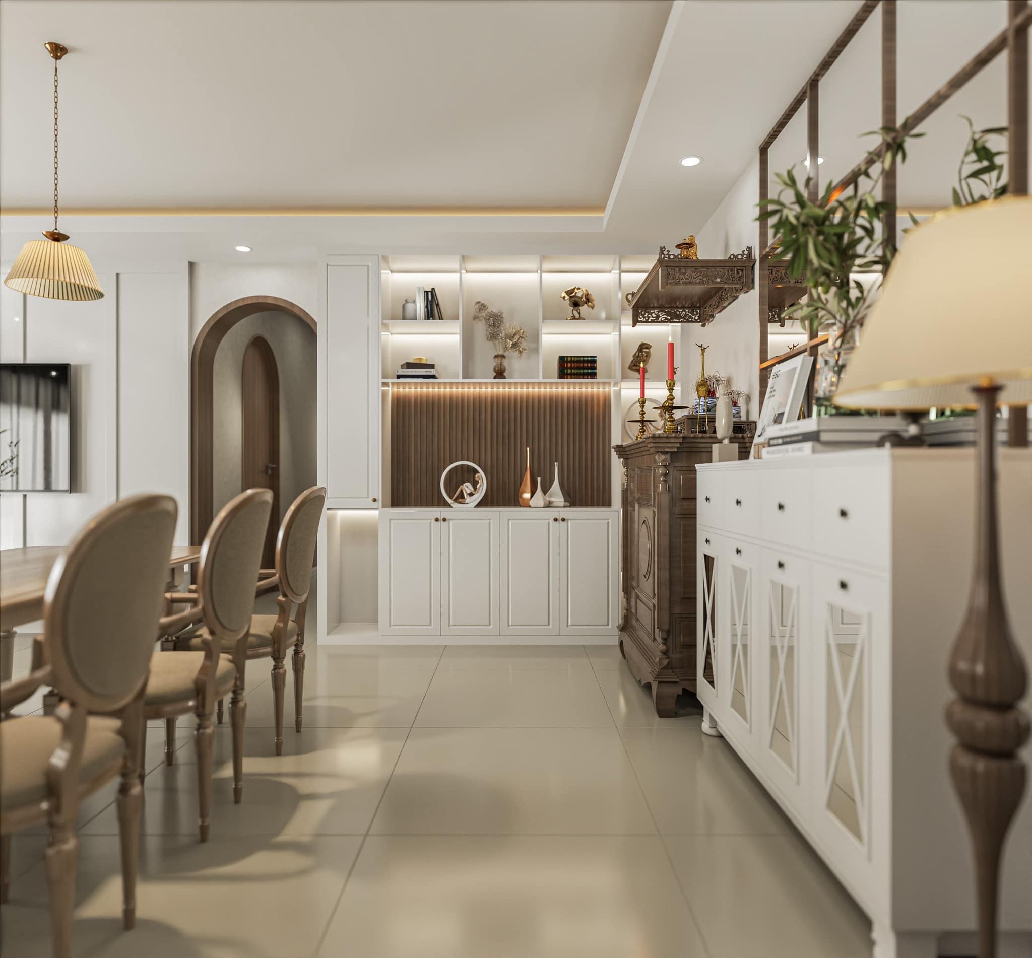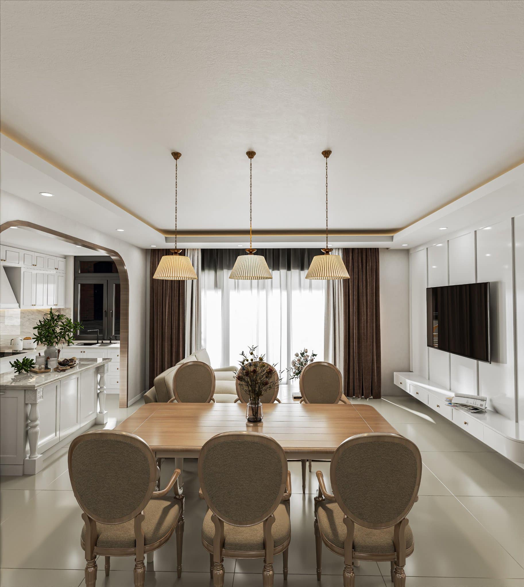 Khu bếp được thiết kế liền mạch với phòng khách, sử dụng tủ gỗ công nghiệp phủ veneer, mặt bàn đá sáng, và đèn thả ánh vàng gợi cảm giác thân thuộc. Bàn ăn 6 ghế bằng gỗ sồi, phủ lớp sơn mờ tự nhiên – không chỉ là nơi ăn uống mà còn là không gian kết nối yêu thương của gia đình.