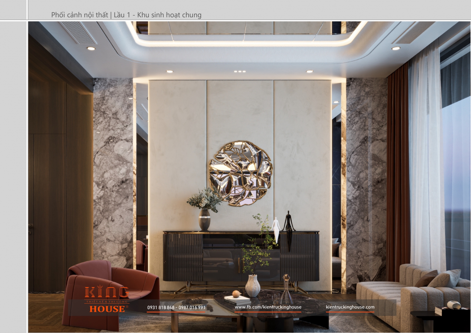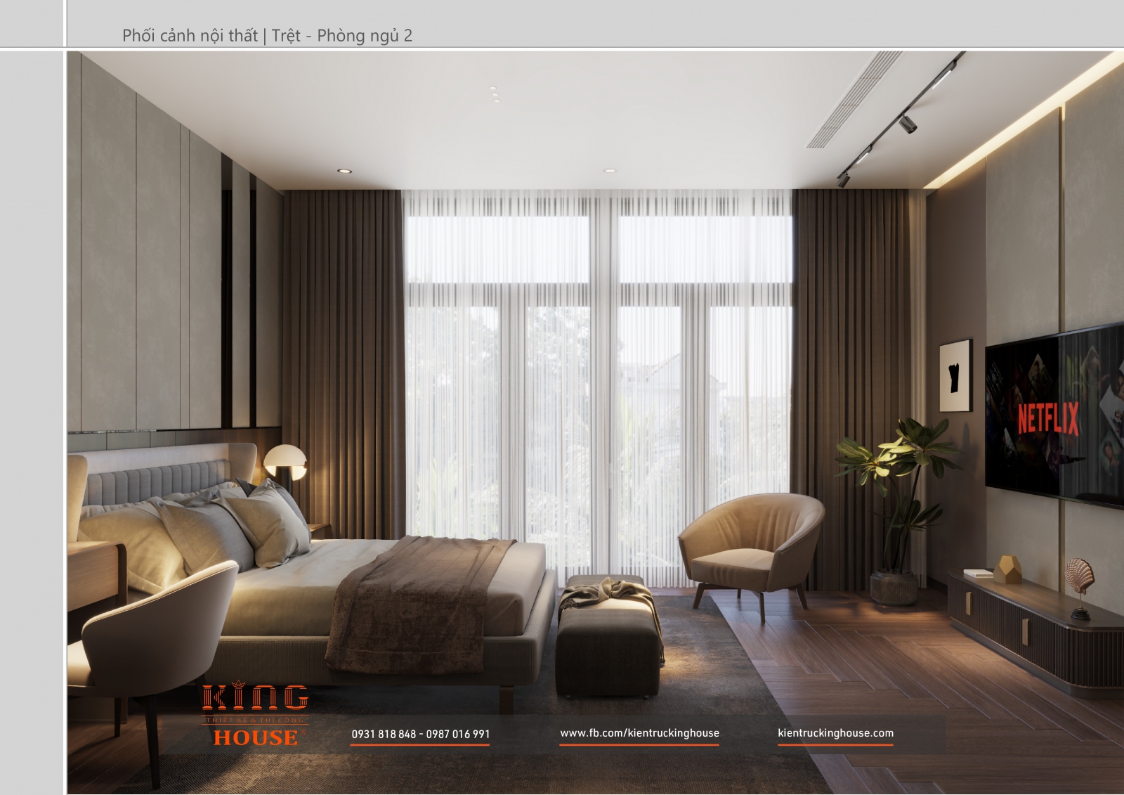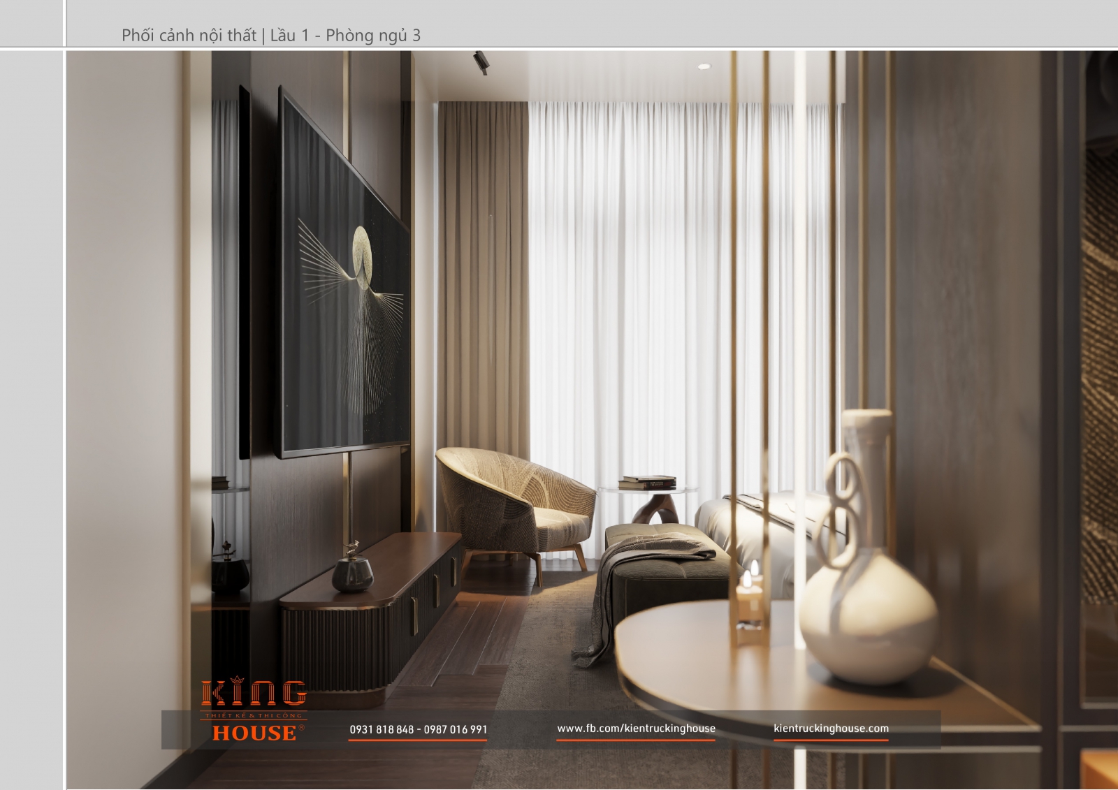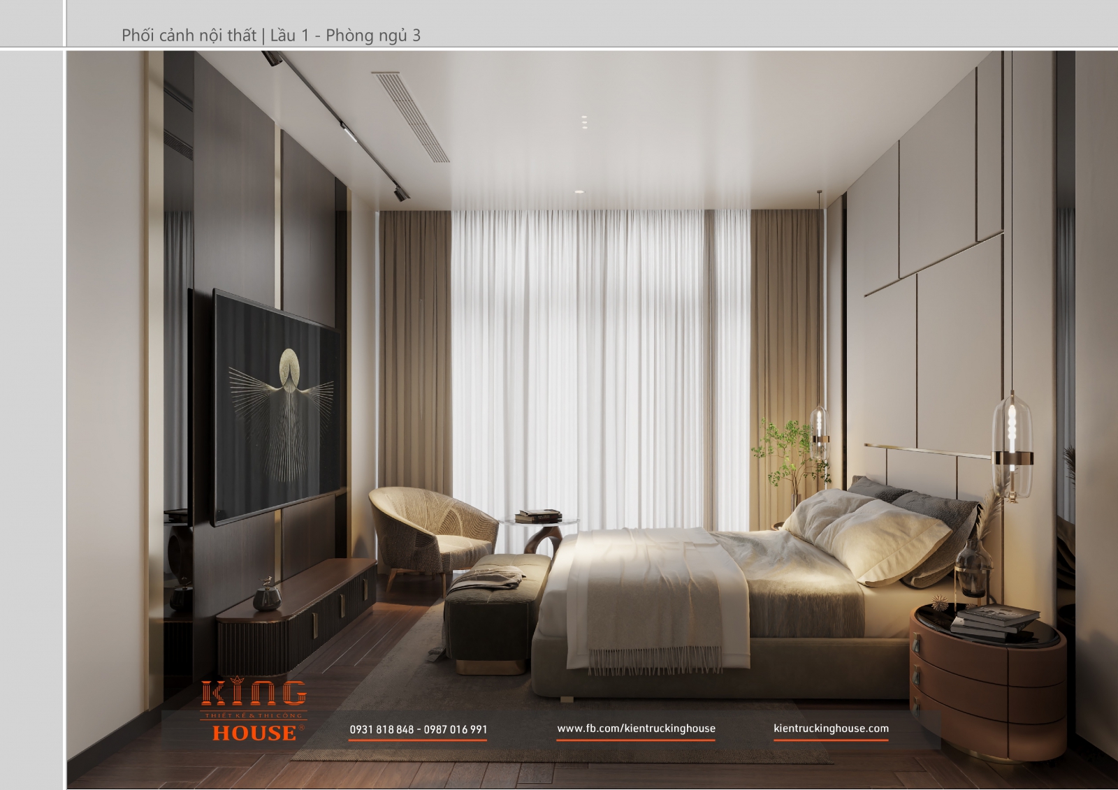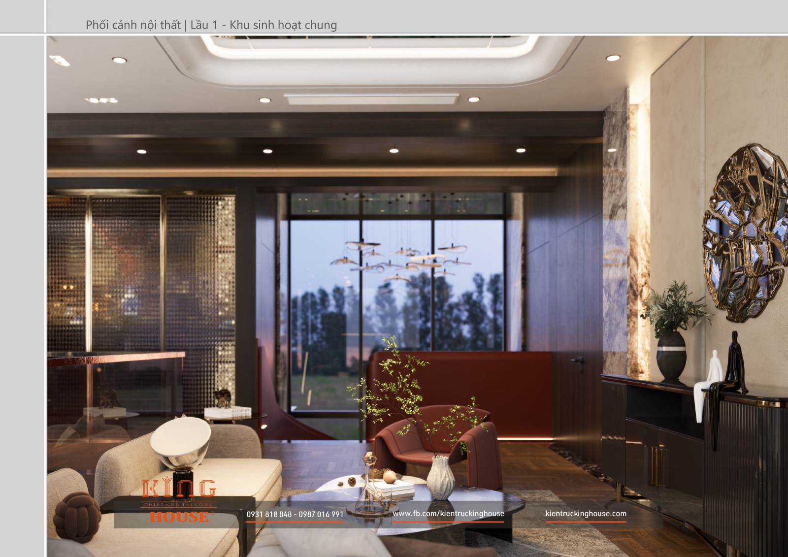 Từ kiến trúc công trình tới thiết kế đều tuân thủ nghiêm ngặt phong cách hiện đại. Đó là hướng tới sự tối giản, tiện nghi với công năng vượt trội và giá trị lâu dài về mặt thời gian. Trong công trình các KTS KING HOUSE lược bỏ hết chi tiết phức tạp trong kiến trúc truyền thống, kết hợp khéo léo các mảng khối bê tông đua ra, giật vào tạo nên các khoảng không lý tưởng cho gia đình chủ đầu tư.