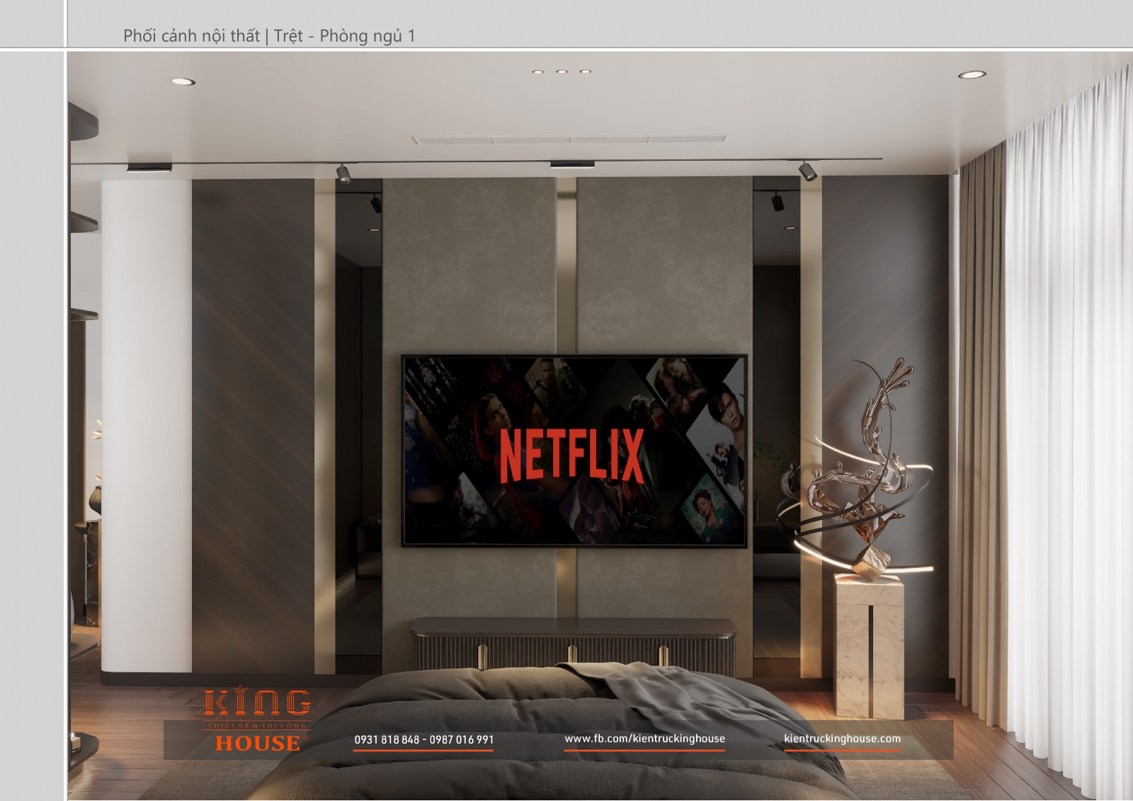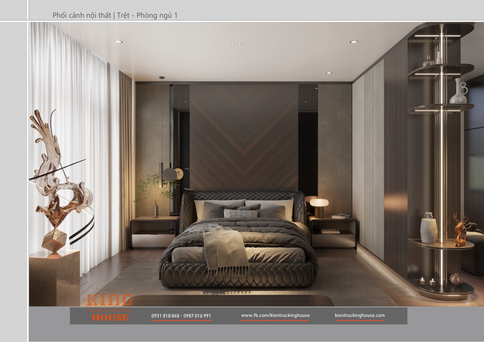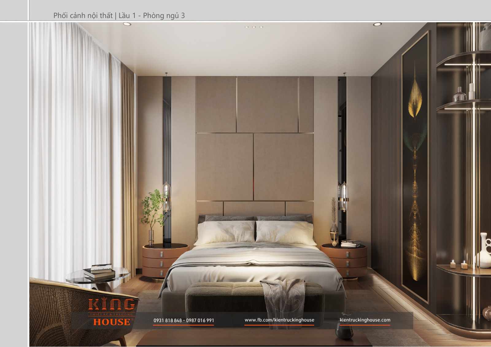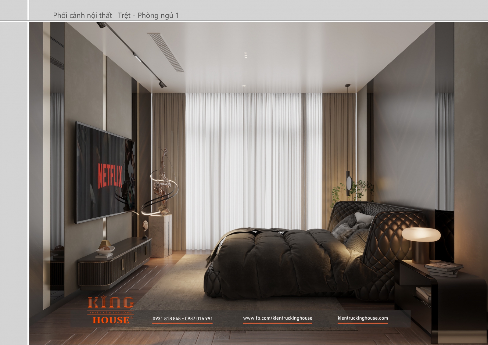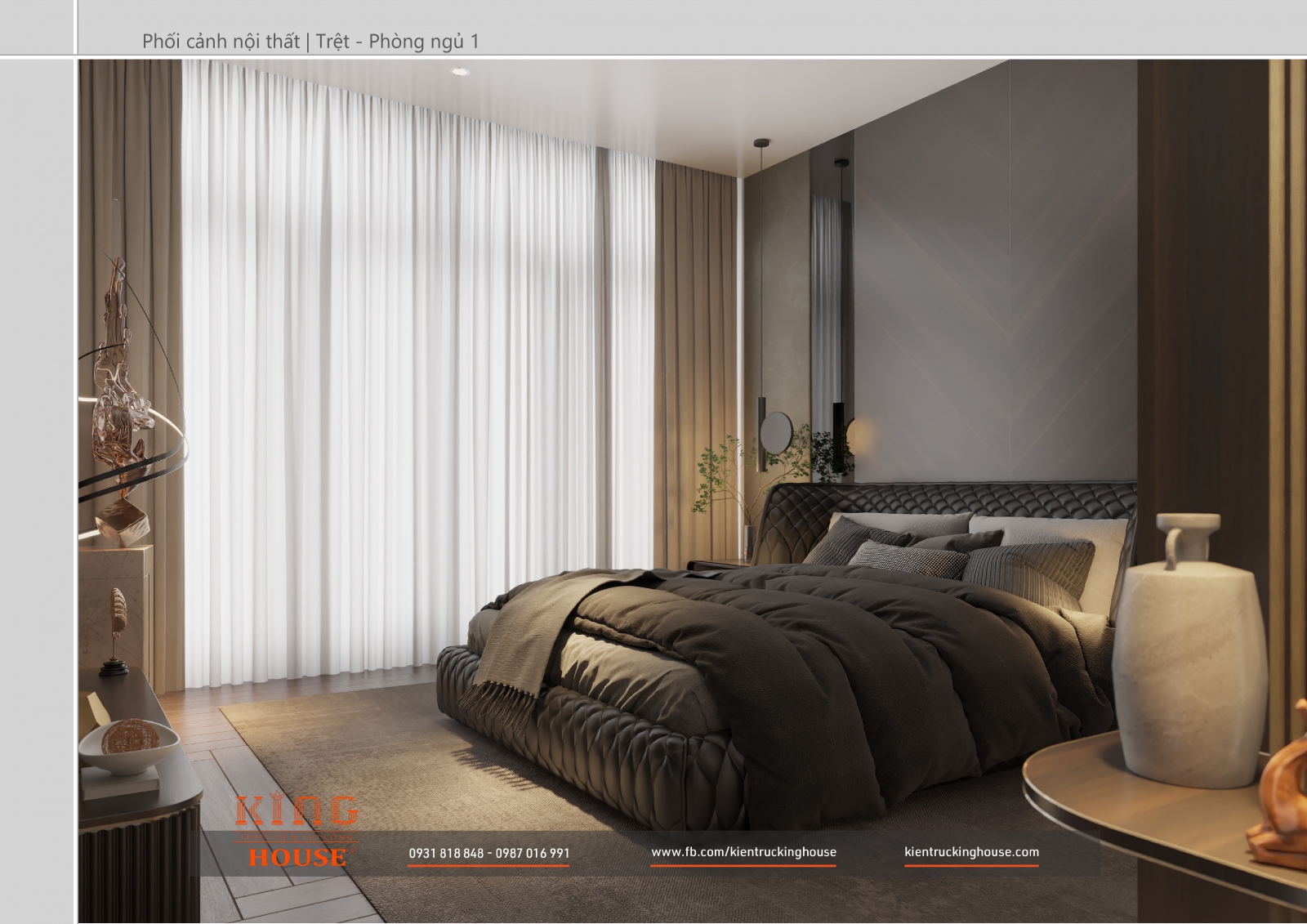Từ kiến trúc công trình tới thiết kế đều tuân thủ nghiêm ngặt phong cách hiện đại. Đó là hướng tới sự tối giản, tiện nghi với công năng vượt trội và giá trị lâu dài về mặt thời gian. Trong công trình các KTS KING HOUSE lược bỏ hết chi tiết phức tạp trong kiến trúc truyền thống, kết hợp khéo léo các mảng khối bê tông đua ra, giật vào tạo nên các khoảng không lý tưởng cho gia đình chủ đầu tư.