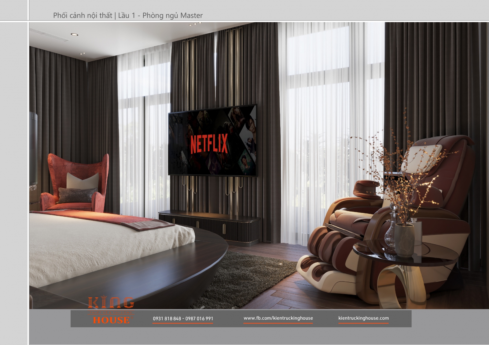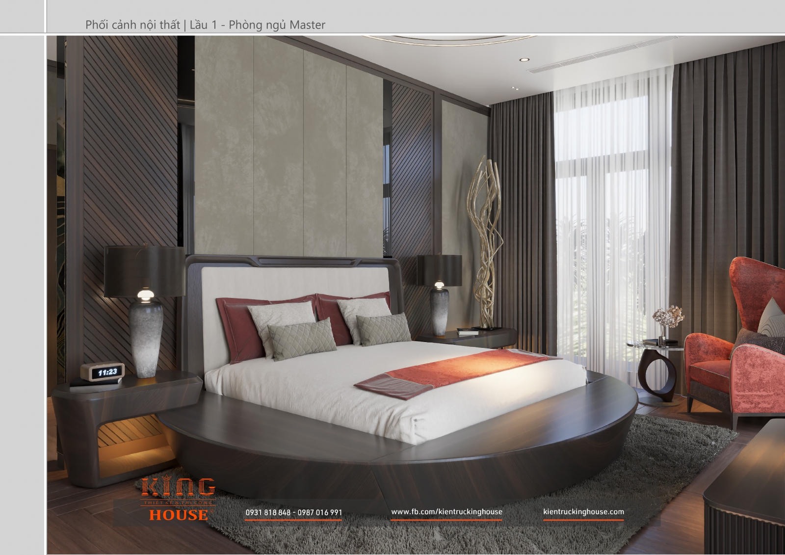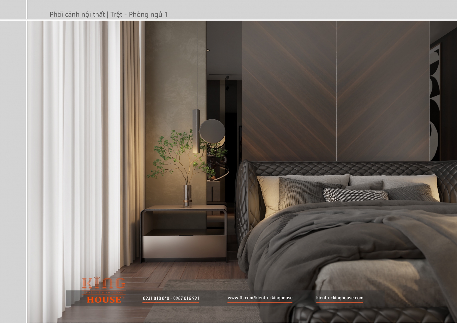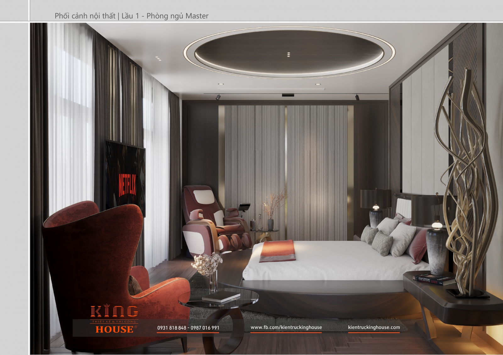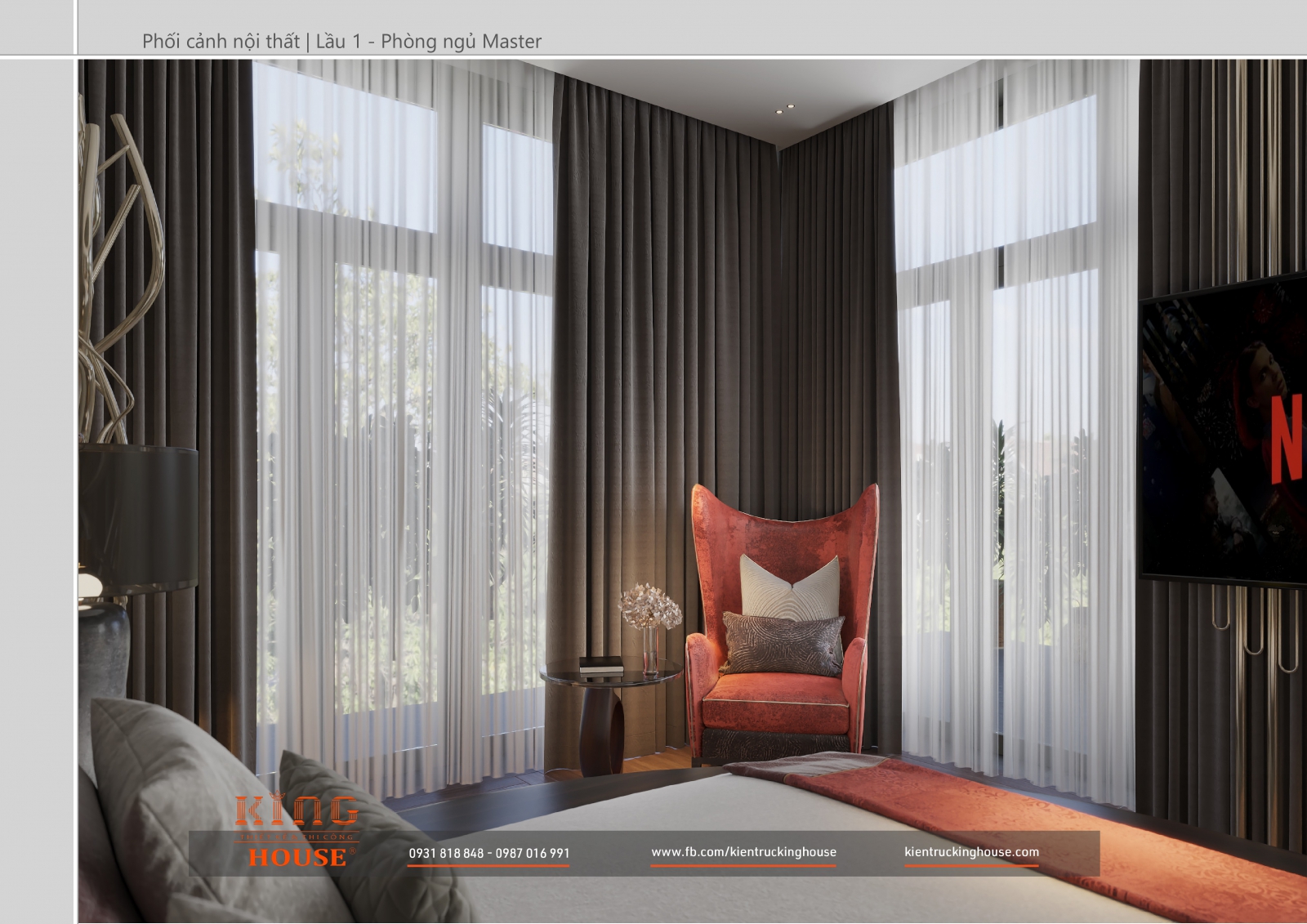 Từ kiến trúc công trình tới thiết kế đều tuân thủ nghiêm ngặt phong cách hiện đại. Đó là hướng tới sự tối giản, tiện nghi với công năng vượt trội và giá trị lâu dài về mặt thời gian. Trong công trình các KTS KING HOUSE lược bỏ hết chi tiết phức tạp trong kiến trúc truyền thống, kết hợp khéo léo các mảng khối bê tông đua ra, giật vào tạo nên các khoảng không lý tưởng cho gia đình chủ đầu tư.