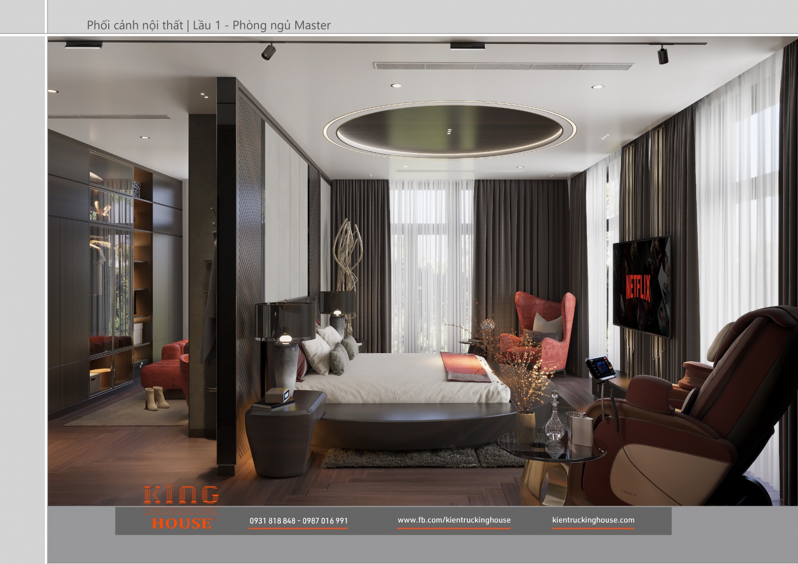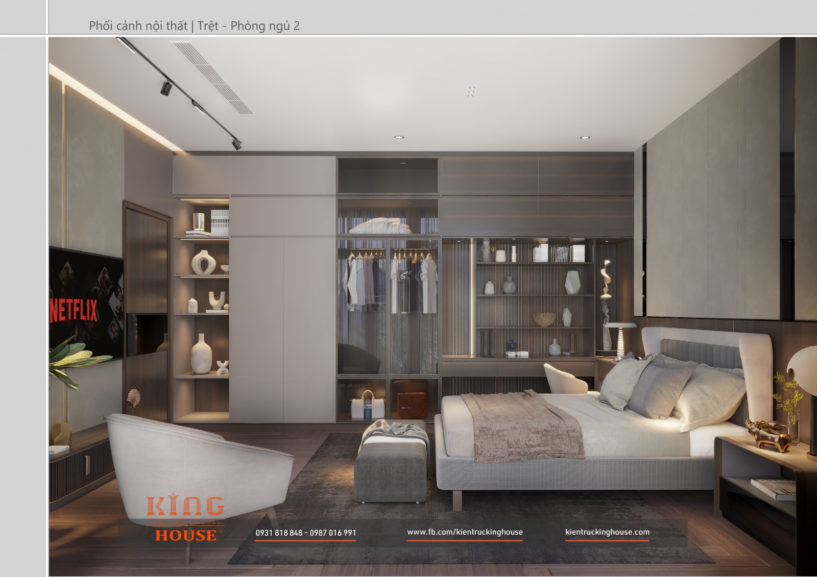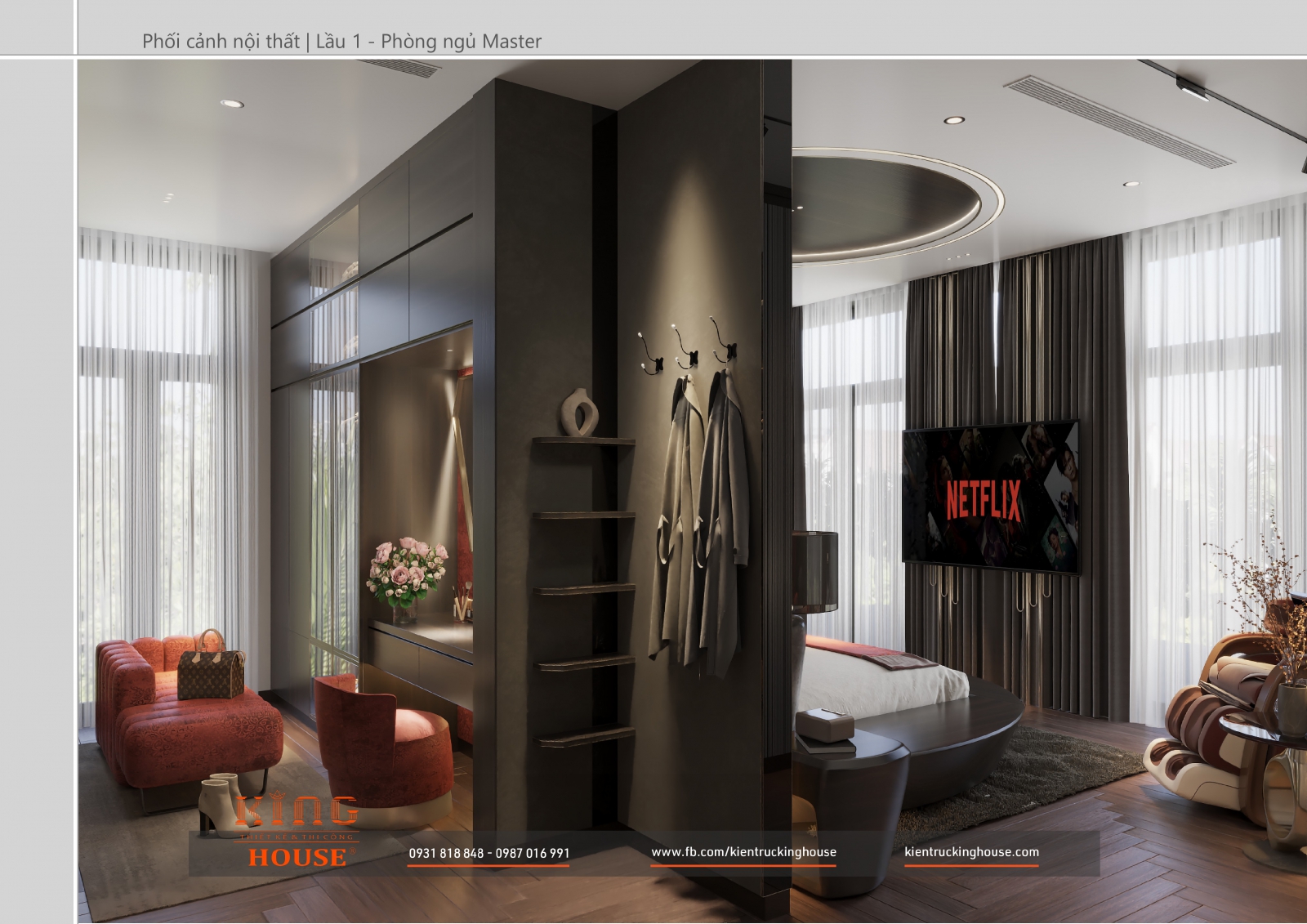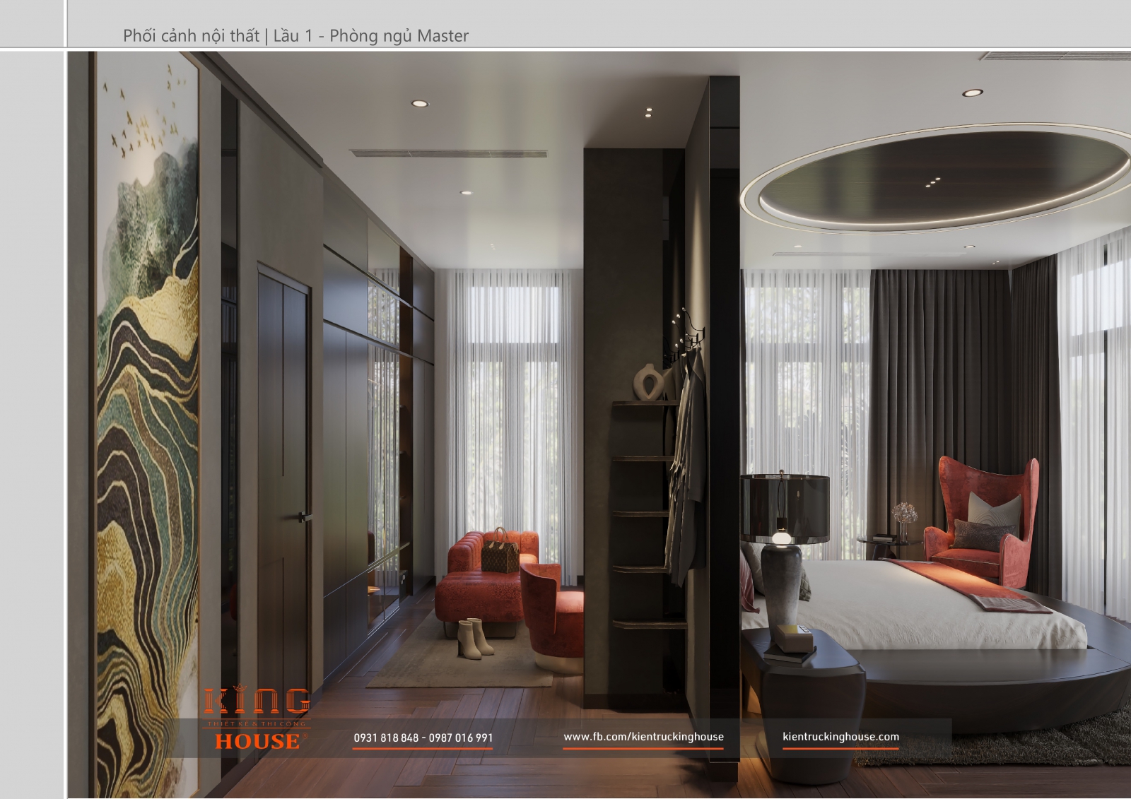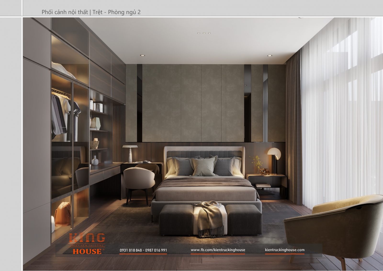 Từ kiến trúc công trình tới thiết kế đều tuân thủ nghiêm ngặt phong cách hiện đại. Đó là hướng tới sự tối giản, tiện nghi với công năng vượt trội và giá trị lâu dài về mặt thời gian. Trong công trình các KTS KING HOUSE lược bỏ hết chi tiết phức tạp trong kiến trúc truyền thống, kết hợp khéo léo các mảng khối bê tông đua ra, giật vào tạo nên các khoảng không lý tưởng cho gia đình chủ đầu tư.