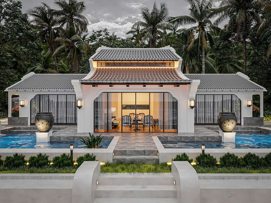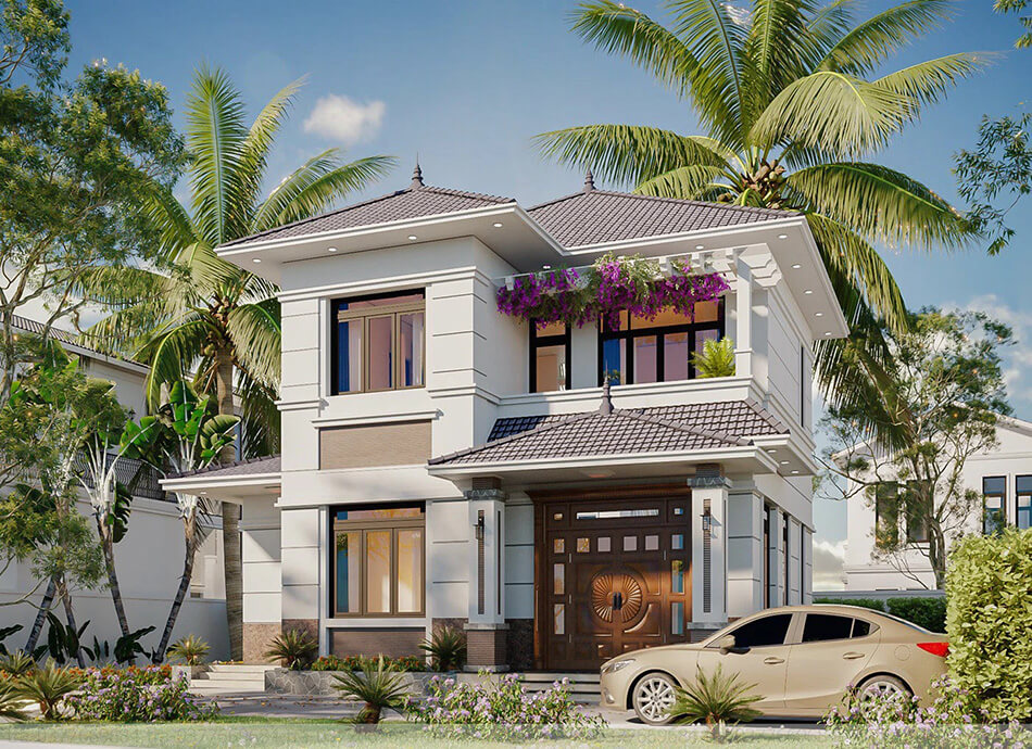 Sự kết hợp giữa kiến trúc Pháp lãng mạn và nét Á Đông truyền thống tạo nên biệt thự sân vườn Indochine độc đáo. Vật liệu tự nhiên như gỗ, tre, gạch bông được kết hợp cùng cây xanh, hoa giấy, hồ nước, tạo nên không gian vừa mộc mạc vừa thanh lịch. Đây là mẫu thiết kế mang lại cảm giác giao thoa Đông - Tây đầy cuốn hút.