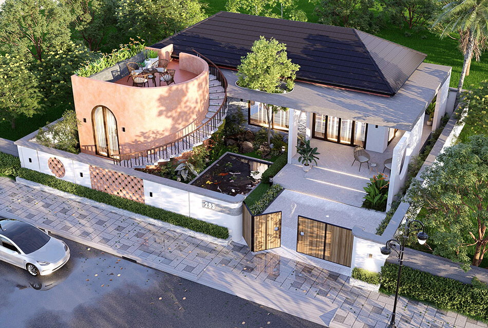 Nếu yêu sự bình dị và hoài niệm, biệt thự sân vườn kiểu Việt sẽ là gợi ý phù hợp. Không gian thường được trang trí bằng chum vại, lu nước, hoa sen, cùng cây xanh nhiệt đới, gợi nhắc đến vẻ đẹp mộc mạc của làng quê Việt Nam. Thiết kế này mang đến sự thân thuộc, ấm áp và gần gũi với đời sống tinh thần người Việt.